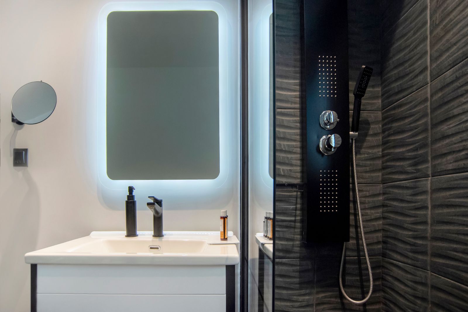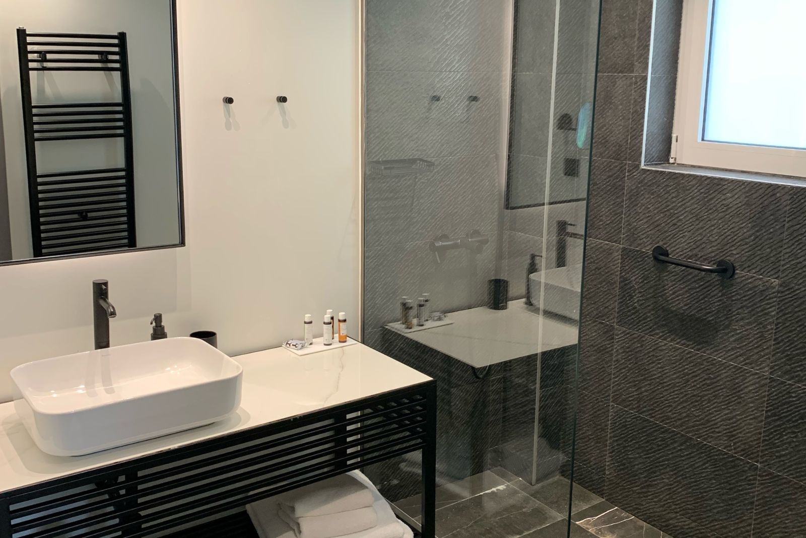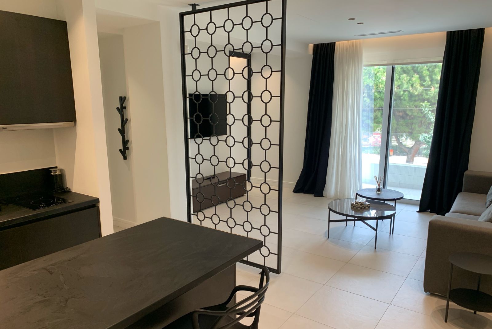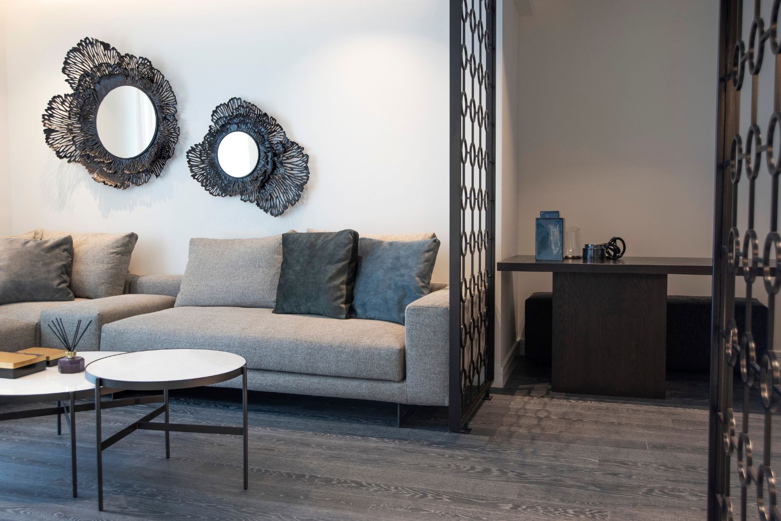 A design-forward apartment for two, Alpha 11 is defined by geometric Italian styling, clean grey tones, and wenge wood accents. Both the living and sleeping areas have direct access to a sun-drenched balcony with tranquil garden views.