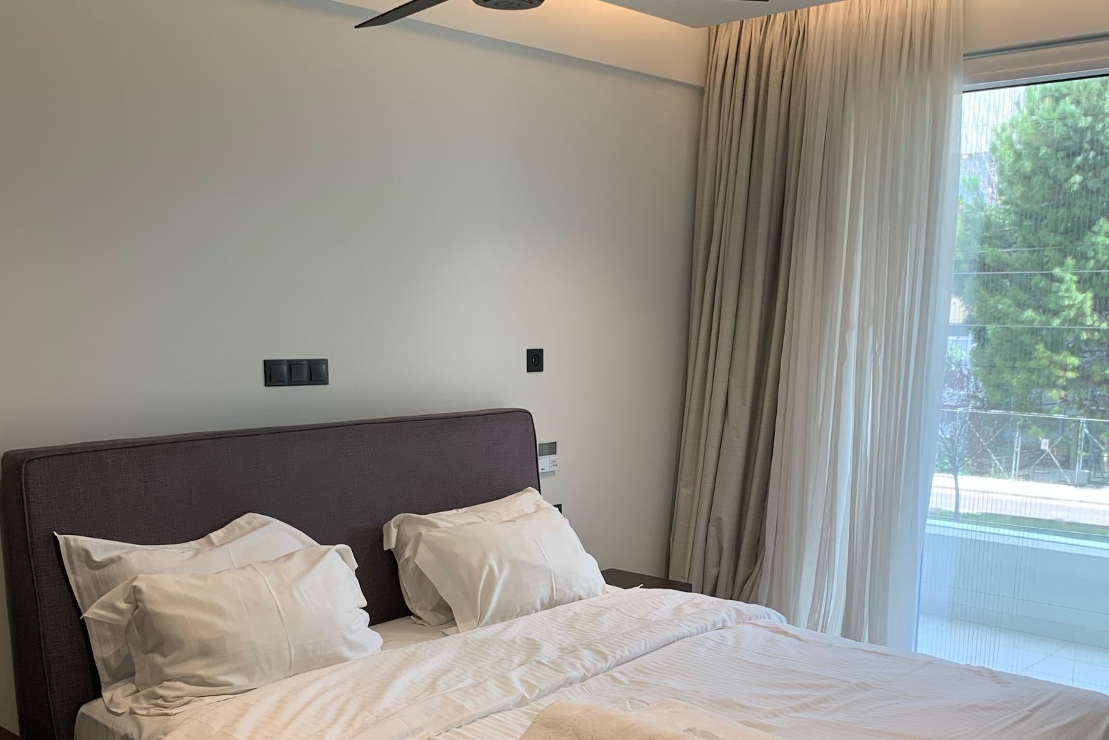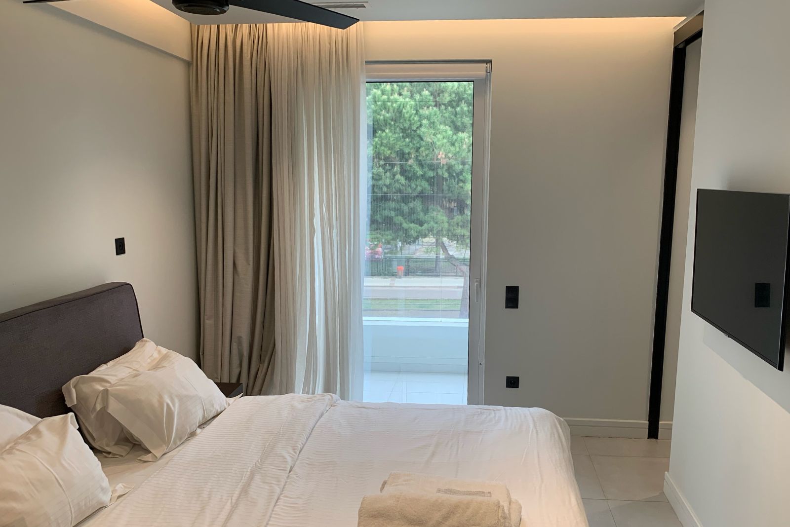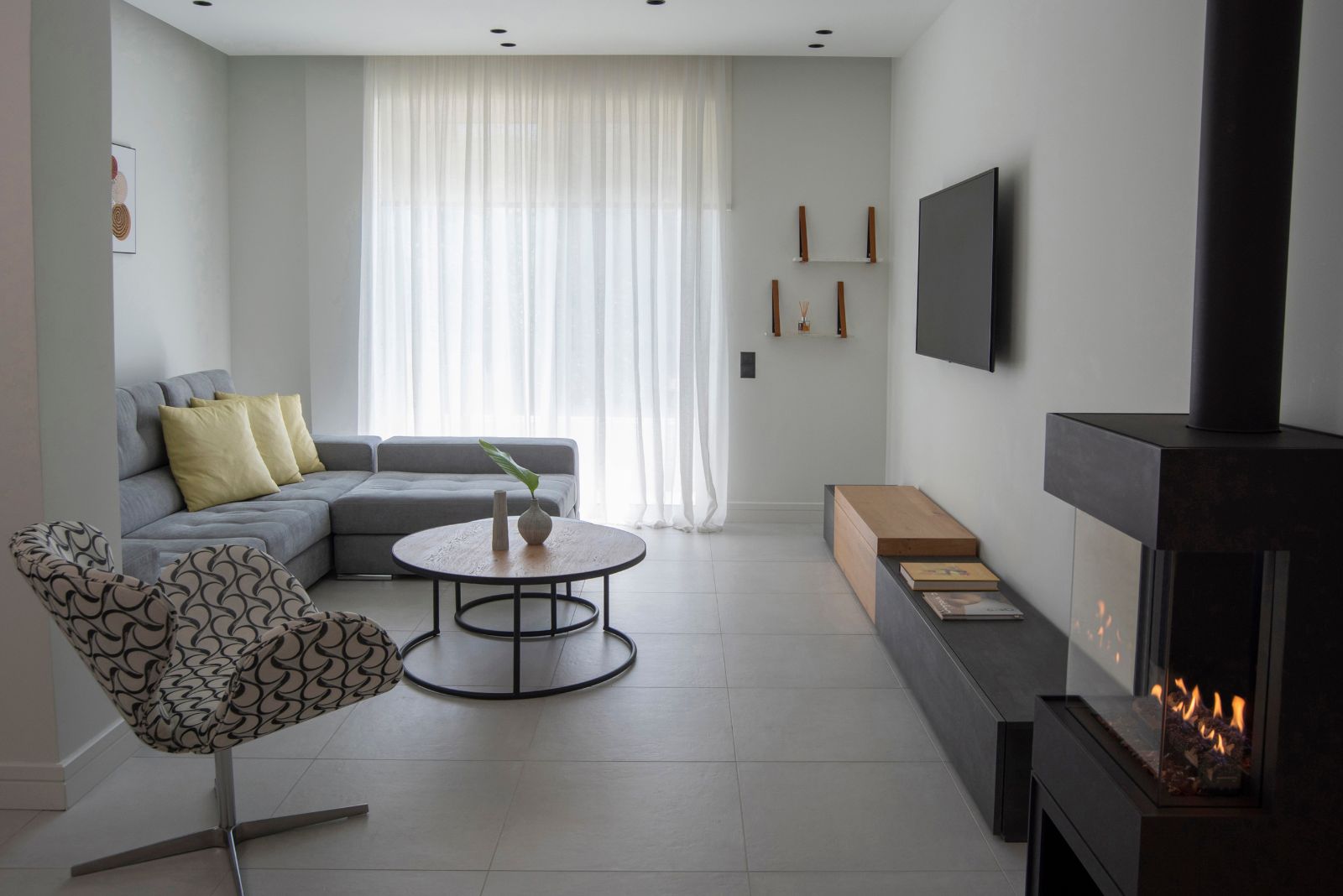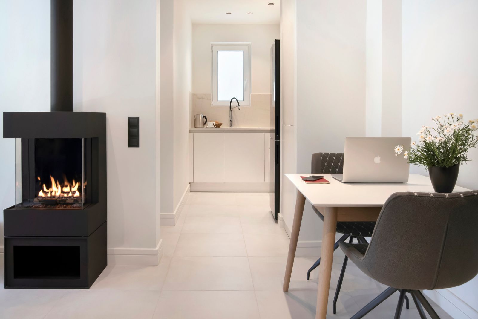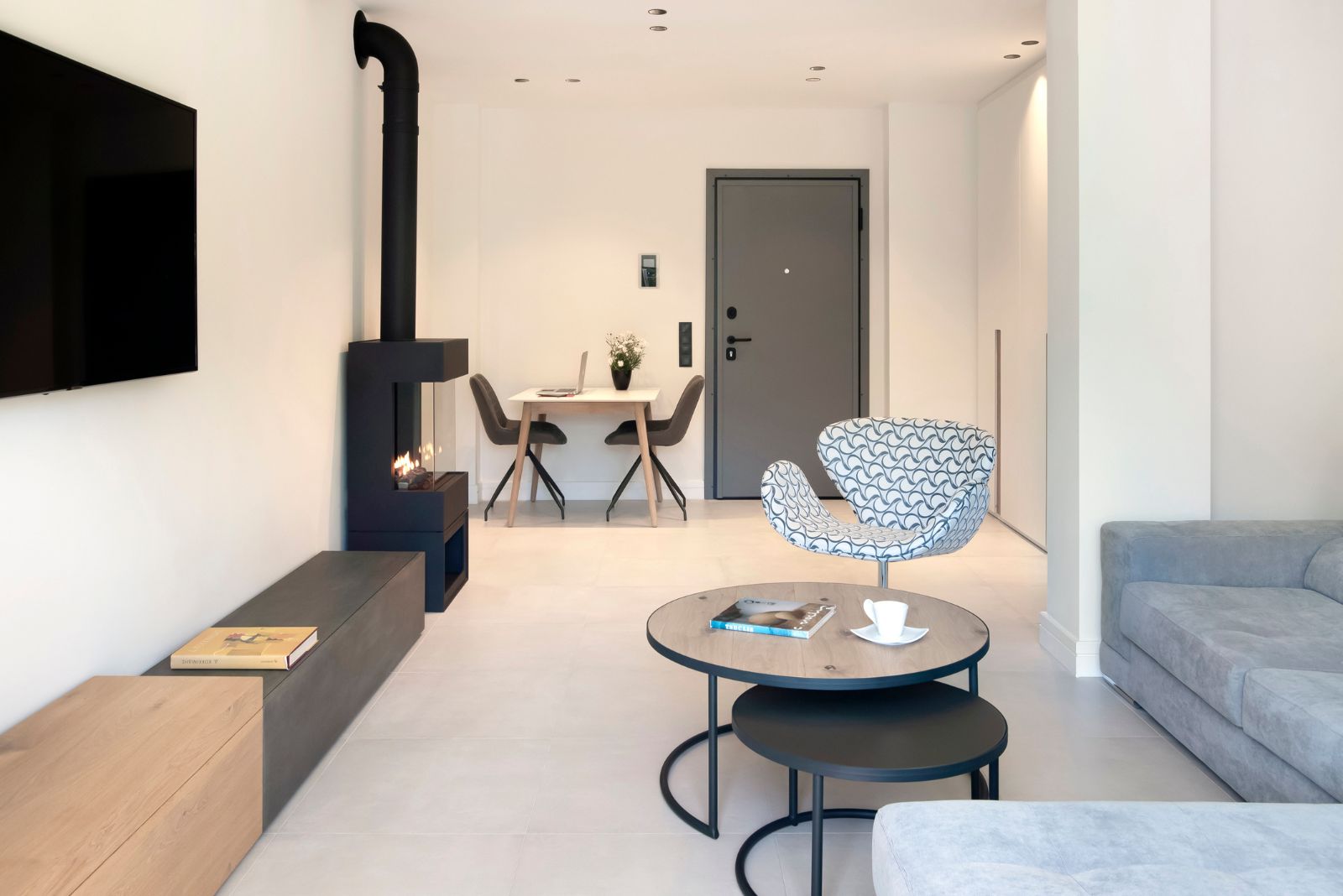 The Alpha 15 Deluxe Apartment brings together modern city living with a warm, homely ambiance. Located on the first floor and overlooking the vibrant urban surroundings of Glyfada, this apartment features a bright living area, a charming electric fireplace, and a generous balcony perfect for morning coffee or evening wind-downs.