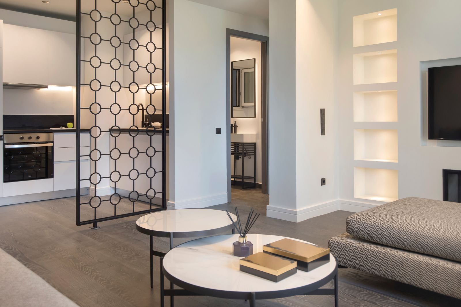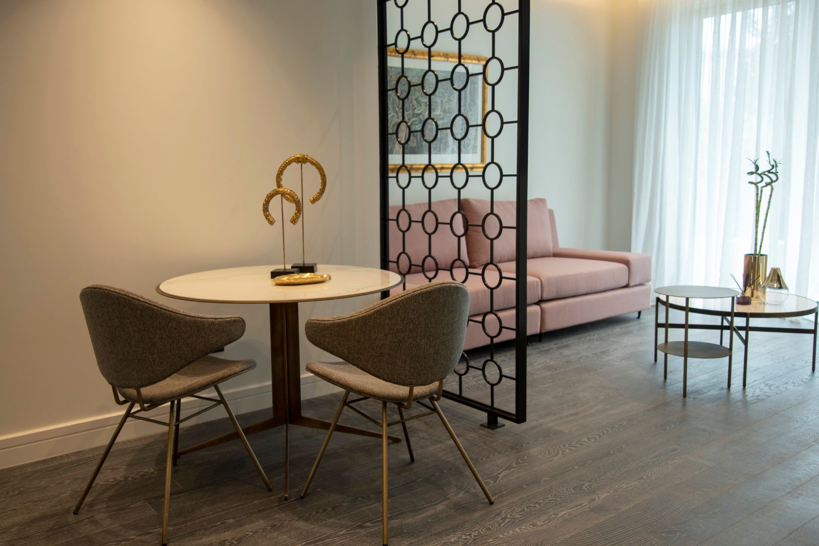 A sophisticated and elegant luxury apartment nestled on the second floor, Beta 16 features a warm grey wooden floor and a two-sided energy fireplace, creating a distinctive ambiance with touches of black, white, and subtle blue. The apartment opens to a private balcony overlooking the park, complete with a cozy outdoor sitting area — ideal for tranquil city moments.