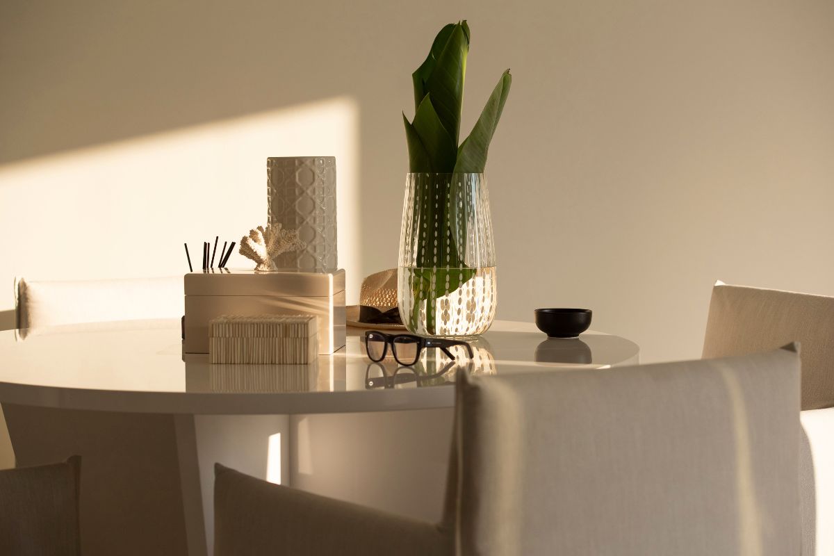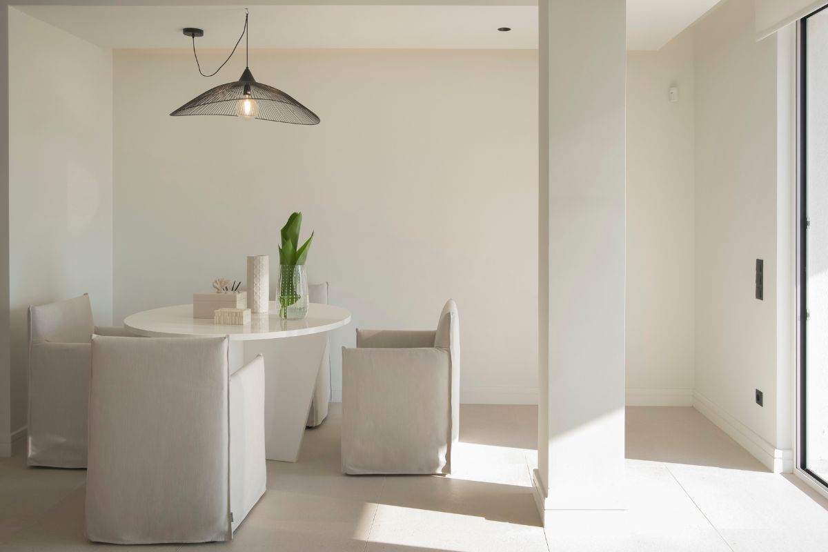Inside, the expansive open-plan living area connects the lounge, dining, and kitchen zones, separated subtly by designer panels. The corner sofa and white rotunda dining area invite comfort and sophistication, while the fully equipped kitchen is a dream for those who love to cook.